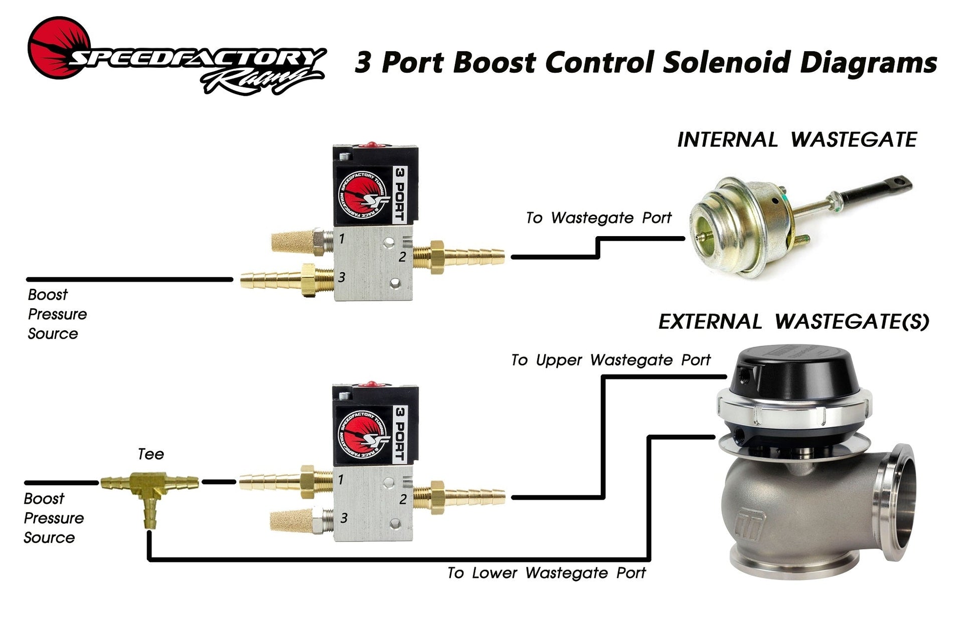 The SpeedFactory Racing 3-Port Boost Control Solenoid Kit allows precise boost control with a PWM (pulsewidth modulation) signal from a source (Engine Control Module or Electronic Boost Controller).