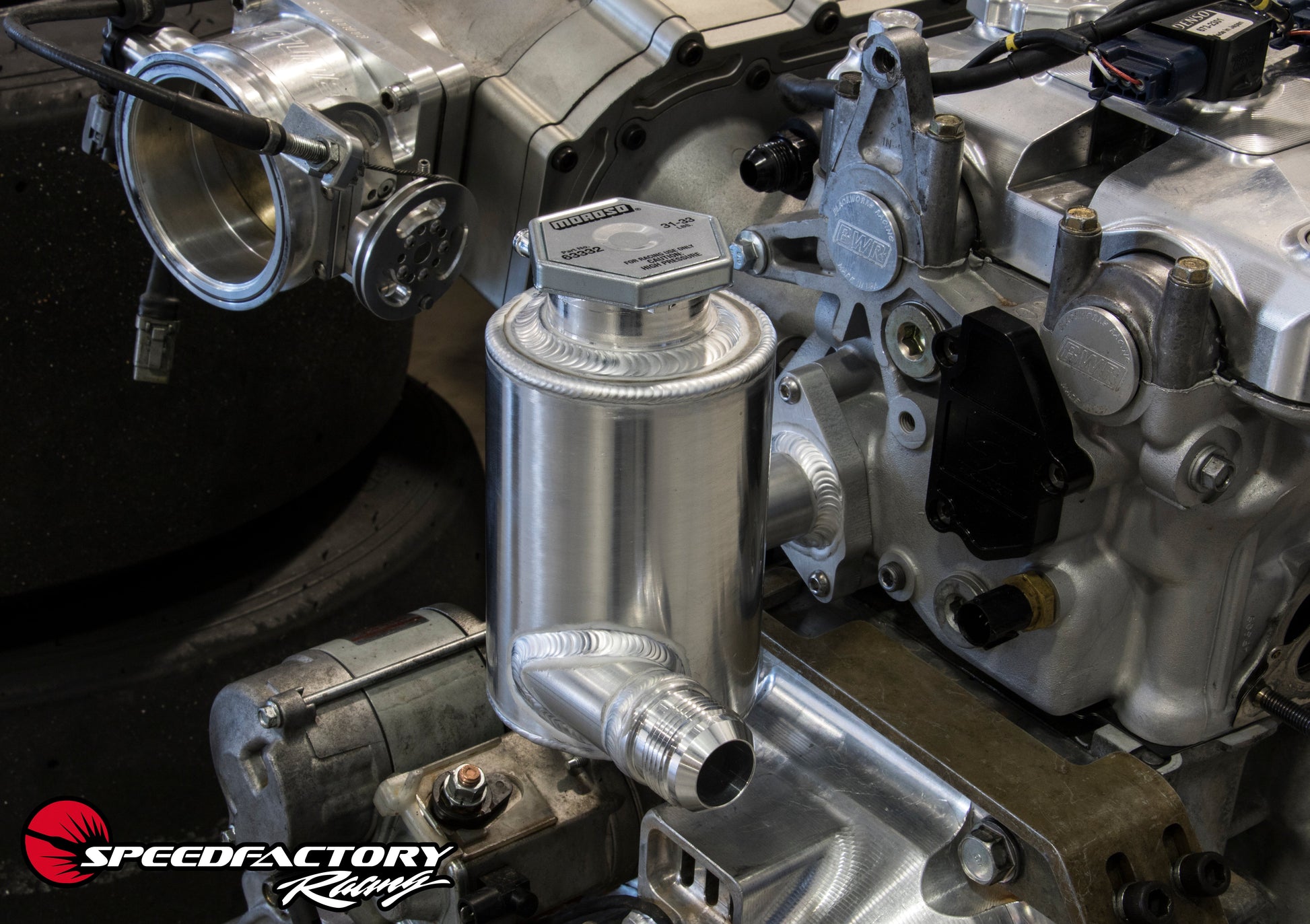 SpeedFactory Racing Honda/Acura B-Series Cooling System Fill Pots are compatible with most aftermarket radiator setups, and change the high point of your cooling system for easy filling and system air bleeding. Your cooling system's capacity will also be increased by roughly 1 quart.