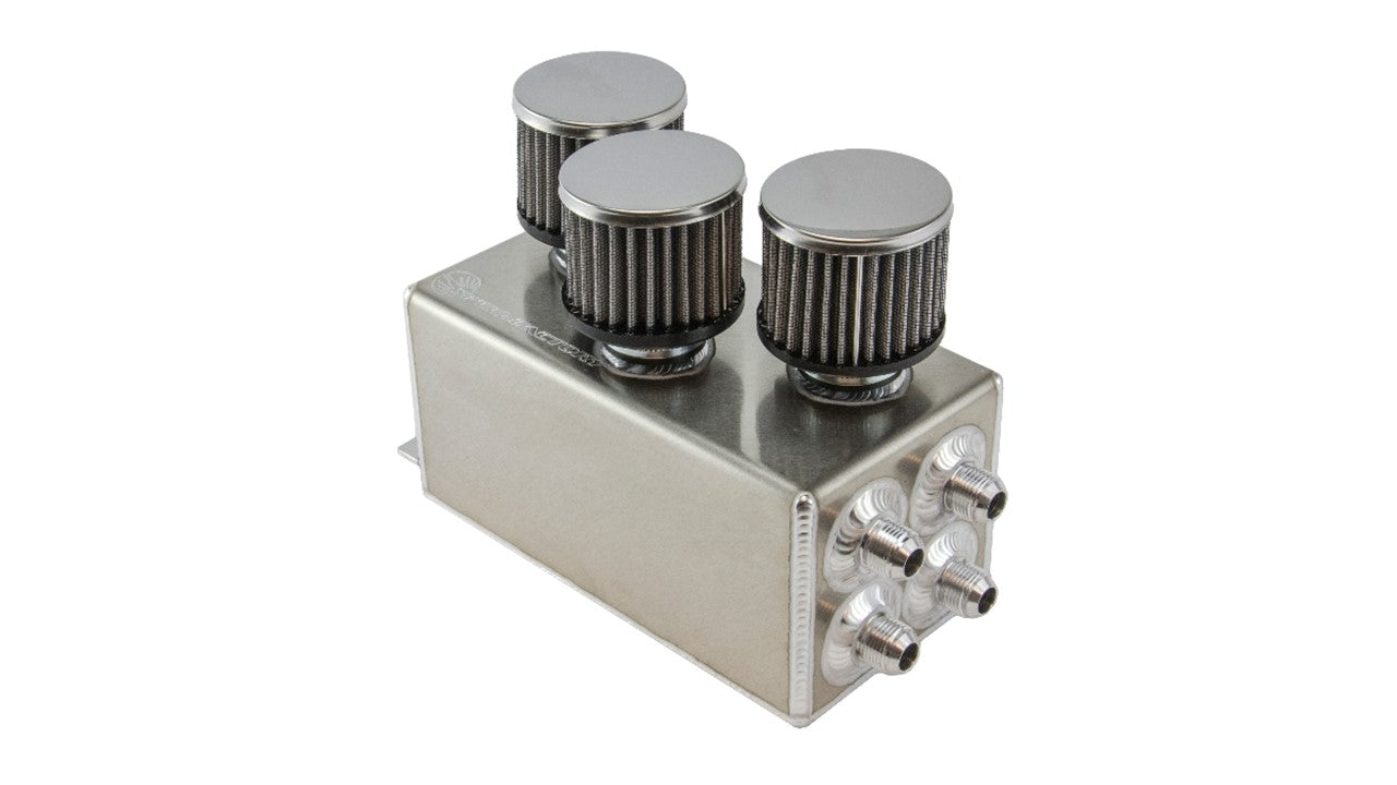 The SpeedFactory 3-Filter Oil Catch Can is specifically designed for forced induction and heavily modified naturally aspirated engines. This internally baffled breather setup is engineered to provide the sufficient crankcase ventilation your high performance engine needs, and also condenses crankcase blow-by oil and moisture correctly. The factory PCV system is replaced and all oil vapors are vented to the atmosphere through three high quality reusable/washable breather filters..