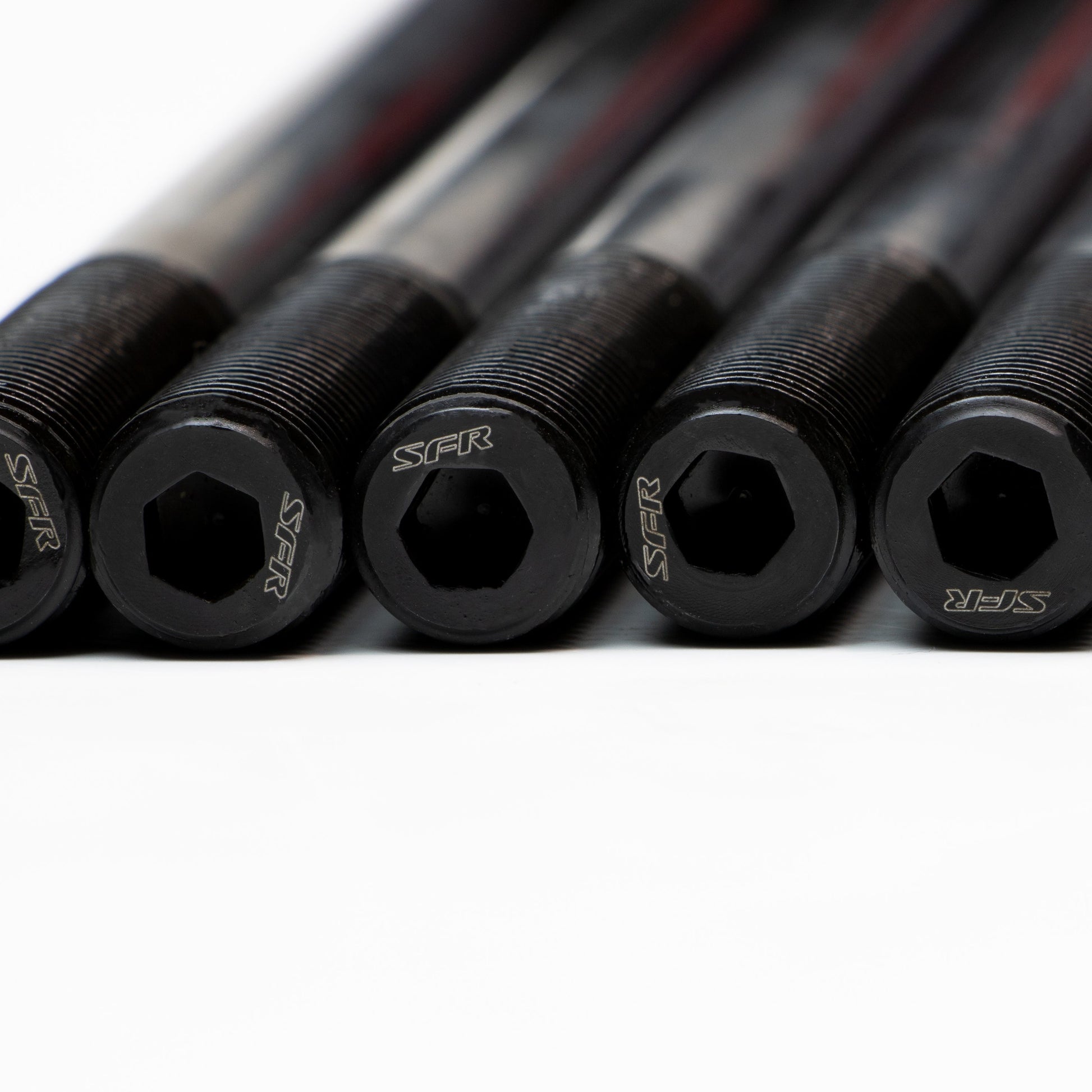The SpeedFactory Racing 4140 Head Stud Kit is great for most forced induction applications up to 800+HP and includes oversized forged nuts & washers for superior load distribution. A hex broach is incorporated on the top of the stud for ease of installation and a dog point end seats the stud in the block and preloads the fastener for consistent & accurate torqing.