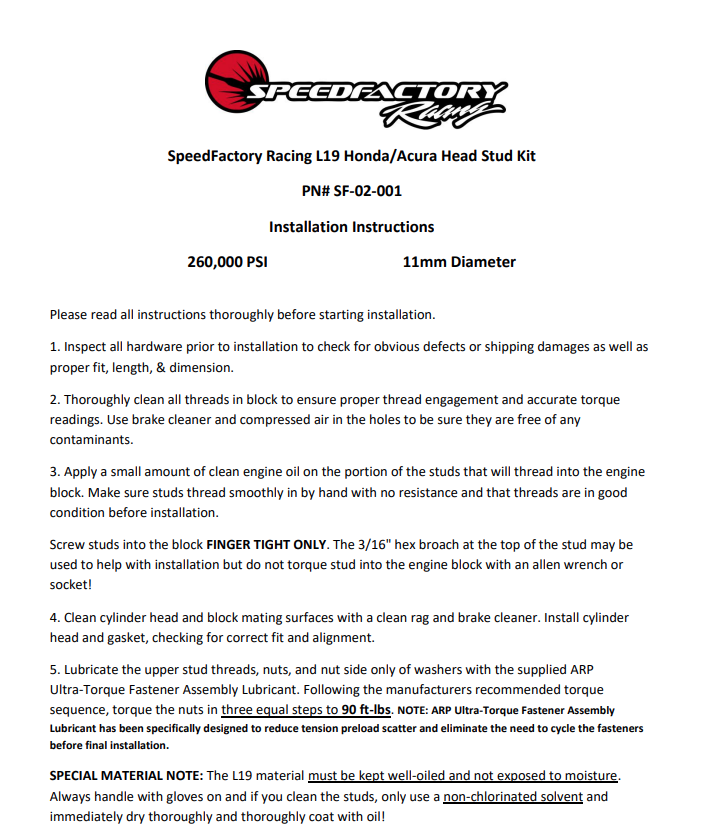 ·Each kit includes a complete set of L19 head studs, nuts, washers, ARP Assembly Lubricant, and detailed instructions with torque specifications.