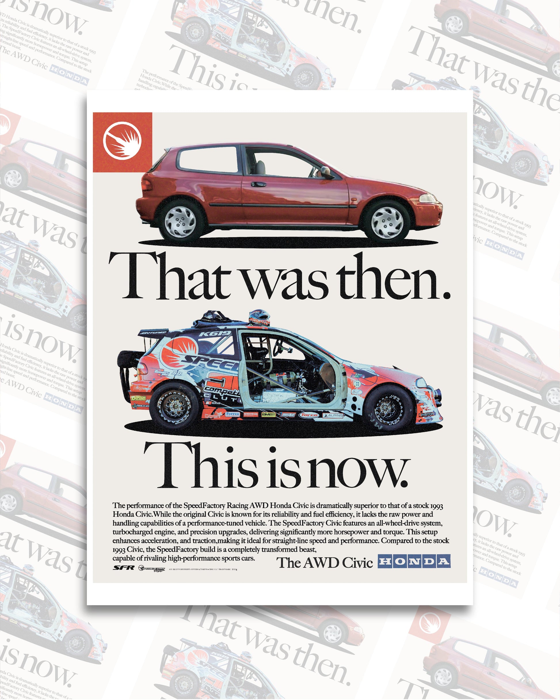 The SpeedFactory Racing "This is Now" AWD Honda poster will instantly elevate the look of your garage or room with a new twist on a vintage design.